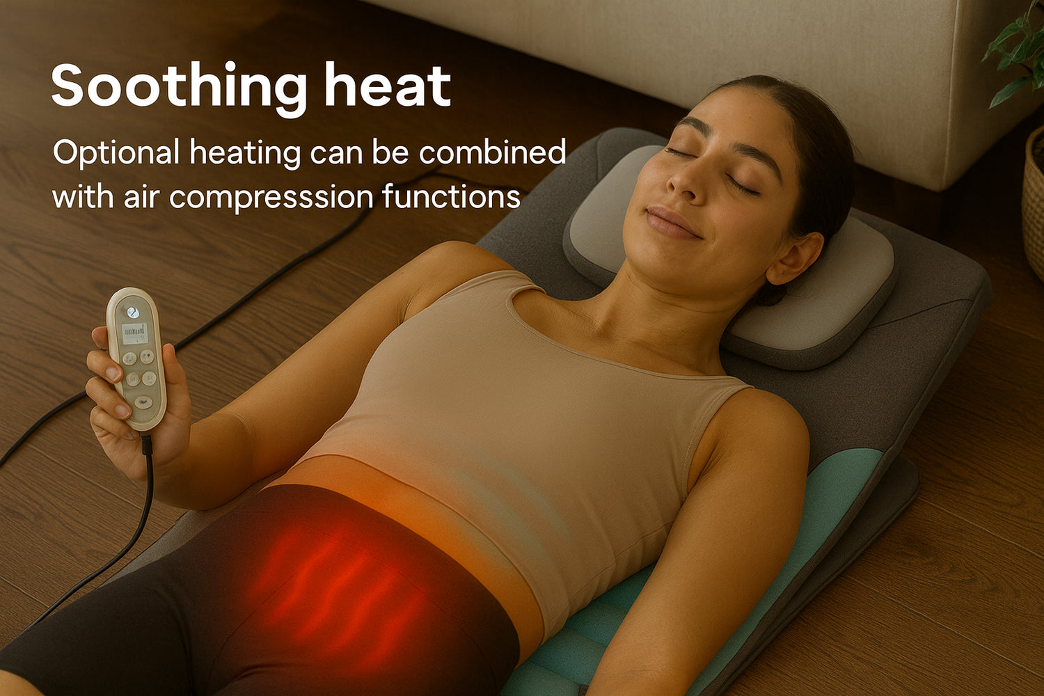 Air Compression Back Stretching Mat — a guided, at-home stretching session that feels like a slow, controlled yoga flow. Inside, precision air chambers inflate and deflate in sequence to mobilize your hips, lower back and mid-spine while you simply lie back and breathe.