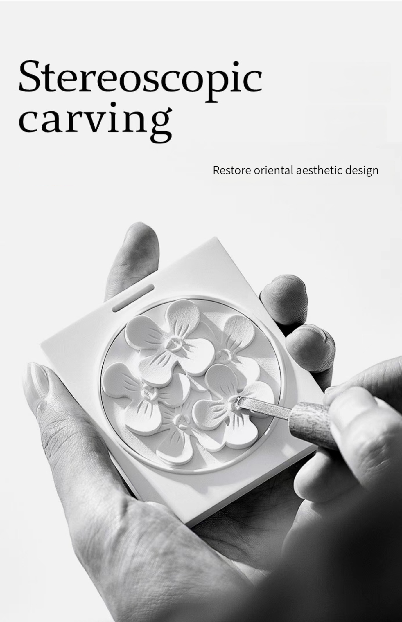 Each design prototype is carved by a senior Chinese carving teacher using the Eastern seal carving technique, purely handmade. The flower patterns are vivid and charming, and the three-dimensional carving design restores Eastern aesthetics, making this series of fragrance pendants a work of art.